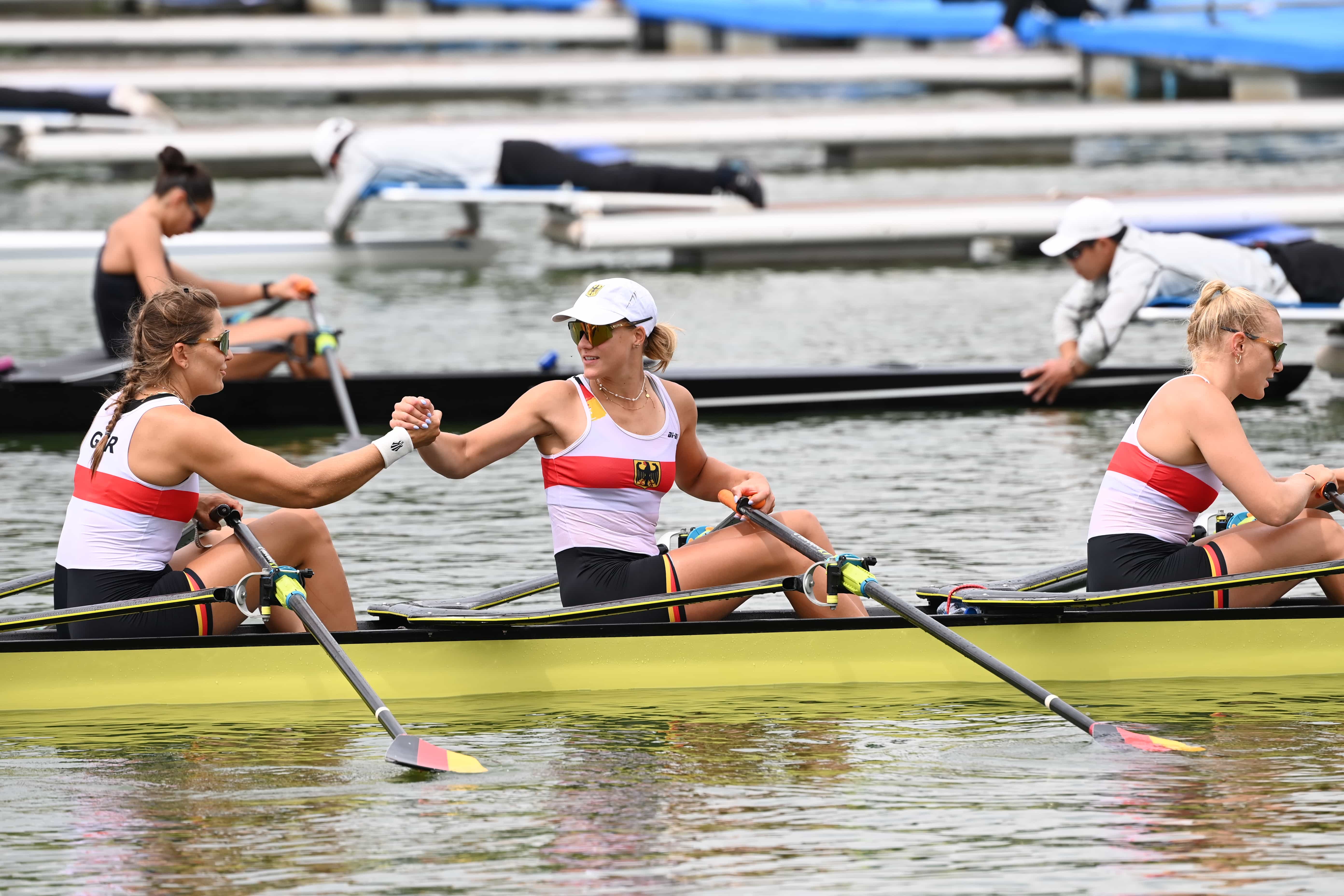Gute Laune nach dem geglückten WM-Auftakt im Lager der Ruderinnen: Der Doppelvierer zog in souveräner Manier ins Finale ein und kann zuversichtlich auf die Entscheidung bei den Titelkämpfen in Shanghai am Donnerstag blicken. „Die Medaille war vorher unser Ziel, die haben wir nach wie vor im Blick. Wir werden das Finale so angehen, dass wir es gewinnen können“, sagte Schlagfrau Pia Greiten.