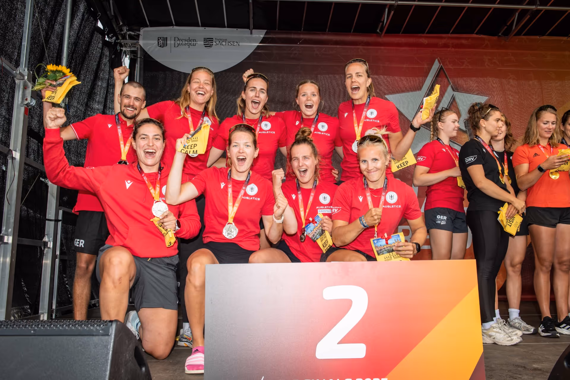 Im Finale gewann schließlich der Achter um den Doppelvierer im vierten Rennen des Tages mit 0,94 Sekunden Vorsprung vor dem Frauenachter. „Das war eher ein Freundschaftsrennen unter uns. Natürlich sind wir happy über den Sieg, insgesamt war es eine gute Stimmung unter allen Teilnehmerinnen“, sagte Sarah Wibberenz, die damit gleich noch einmal die großartige Stimmung bei der Siegerehrung im Finalspark genießen konnten und ihre zweite Medaille überreicht bekam: Gold im Achter nach Bronze im Einer.